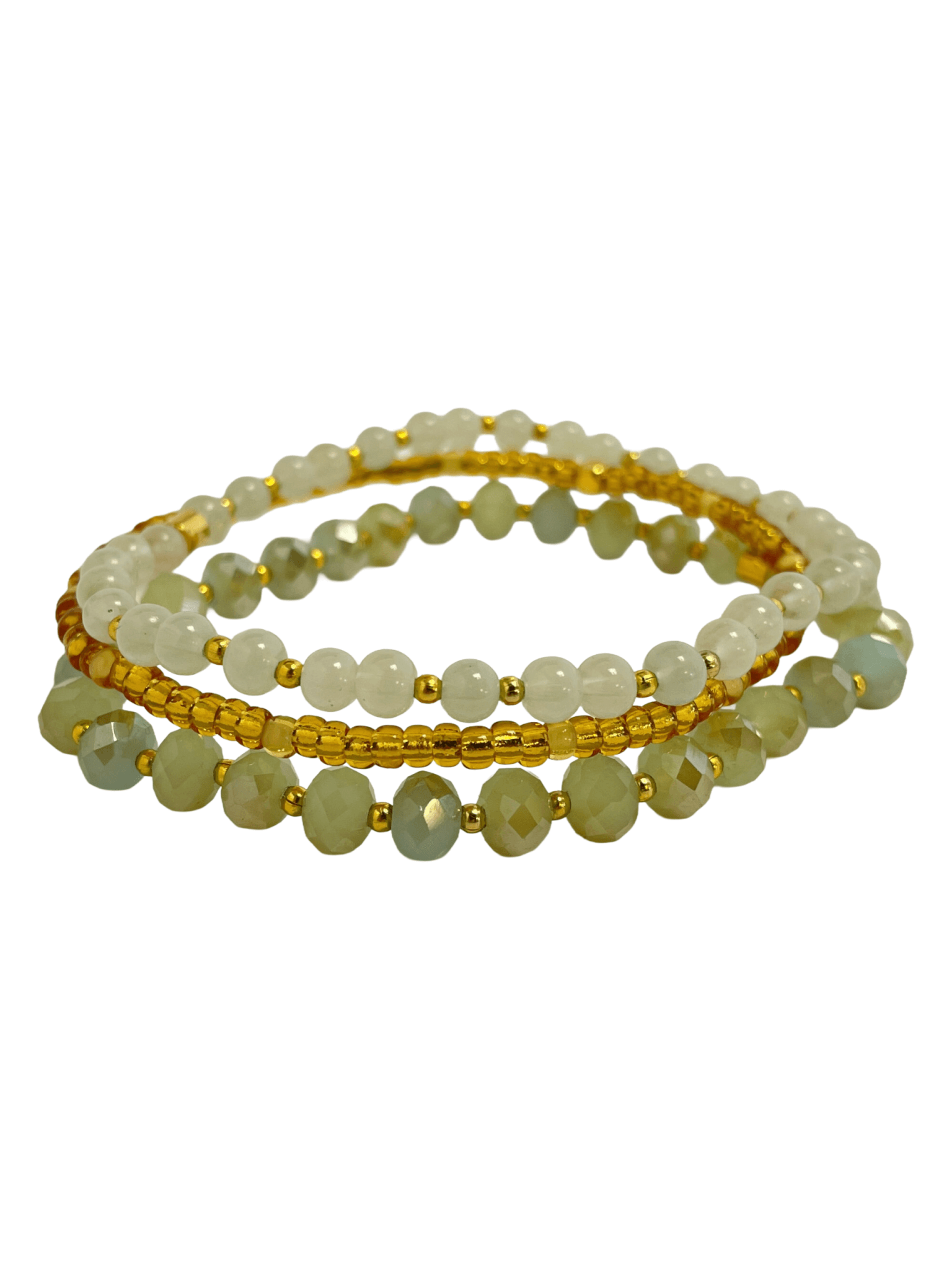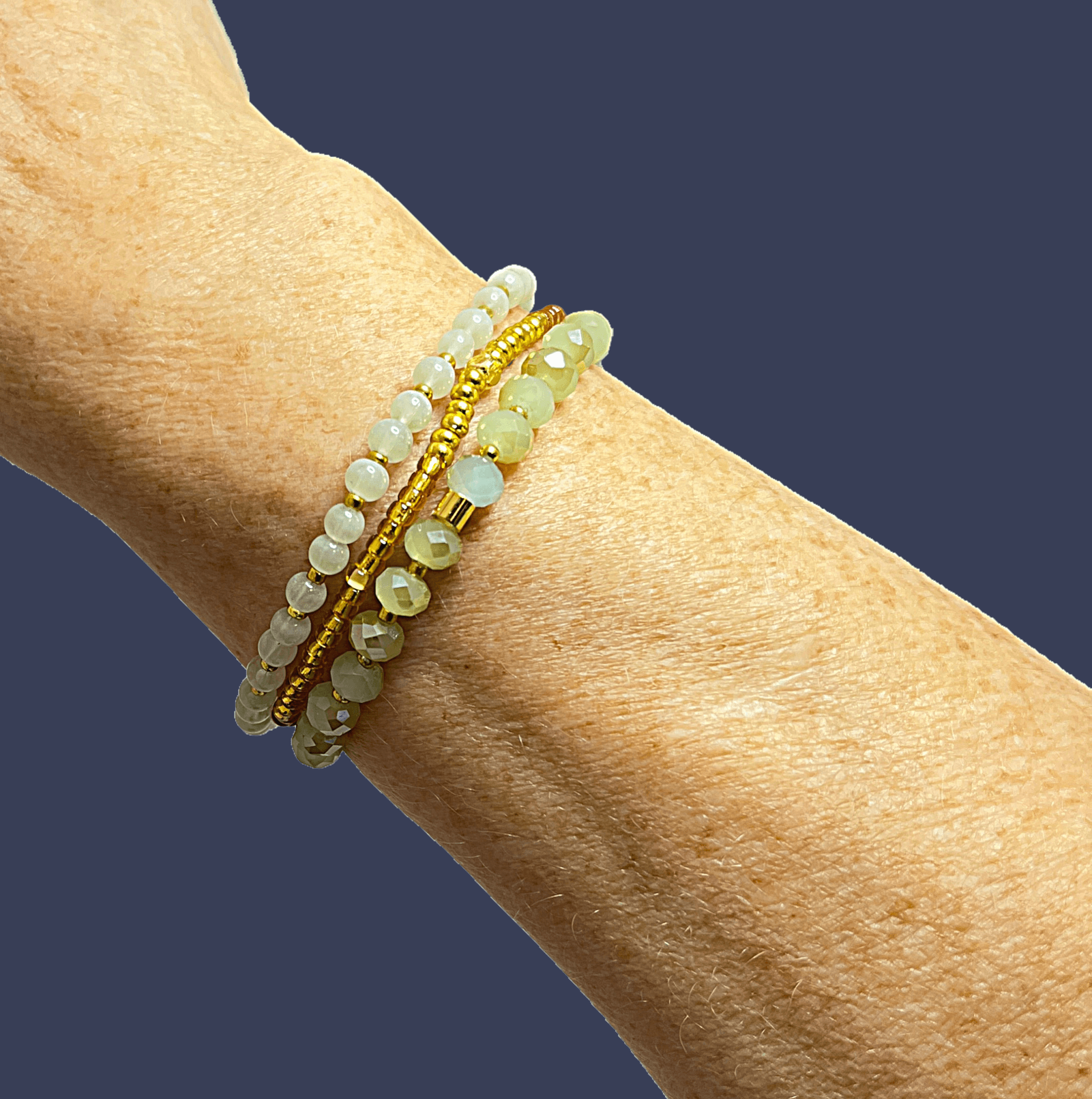 Deze armbandenset heeft subtiele zachte pasteltinten en is gemaakt van facetkralen in aventurijn-look met goudkleurige details.