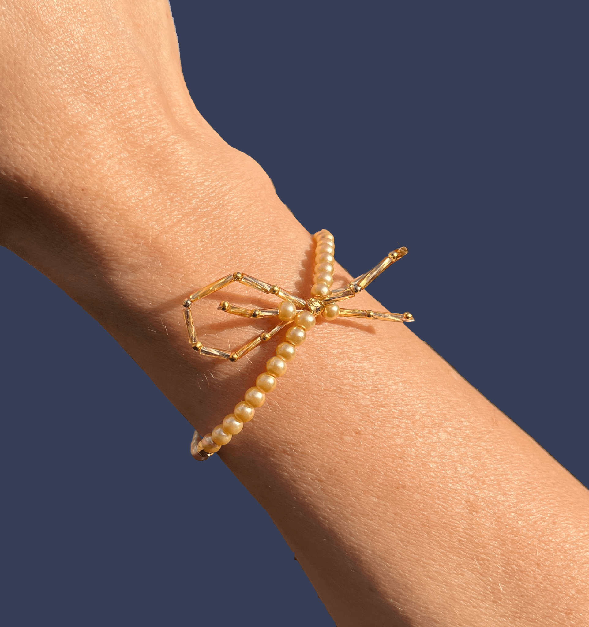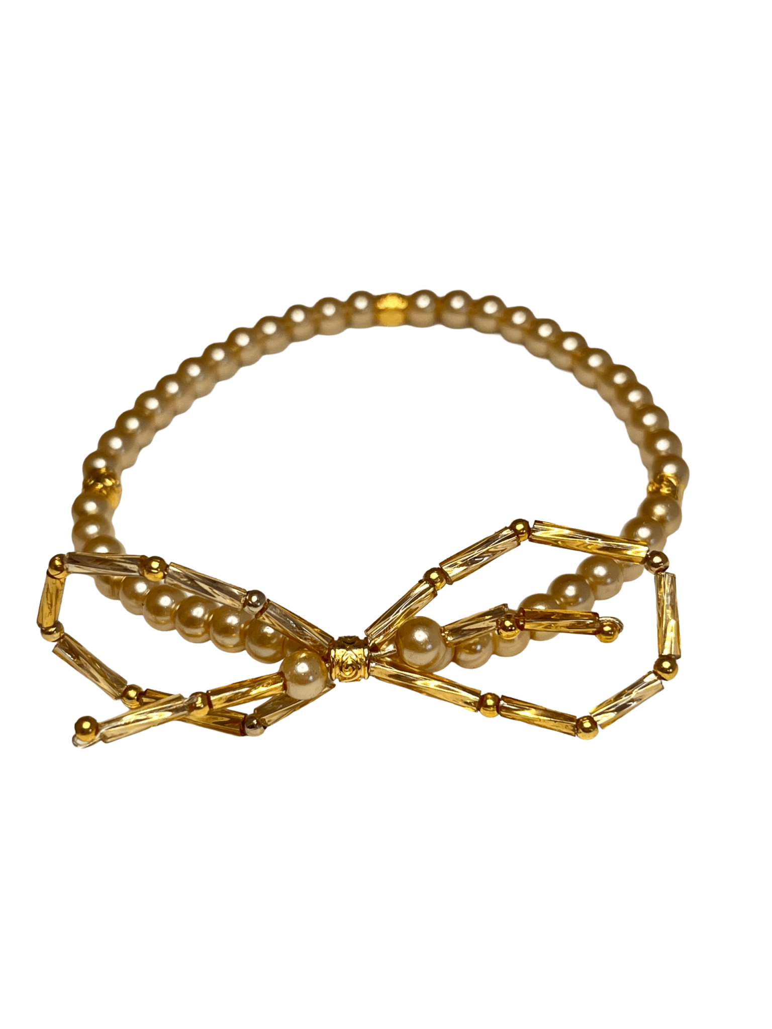 Deze licht gouden armband heeft een feestelijke uitstraling door de strik en gouden accenten. De band is elastisch.